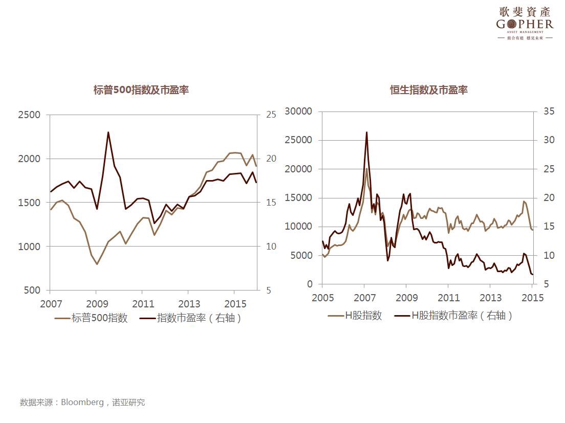 H 股指數(shù)的市盈率約6.7倍(2015年9月末),與過去5年(約9.1倍)和過去10年(約12.8倍)的平均相比處于低位,甚至低于2008年金融危機(jī)時的水平,反映了市場對中國經(jīng)濟(jì)前景的擔(dān)憂,其中還包括人民幣進(jìn)一步貶值的可能性。