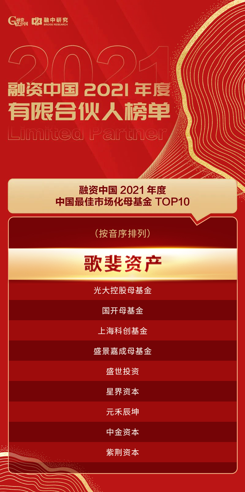 2022年5月12日,融資中國發(fā)布了「2021年度有限合伙人榜單」。歌斐資產(chǎn)斬獲“2021年度中國最佳市場化母基金TOP10”大獎。