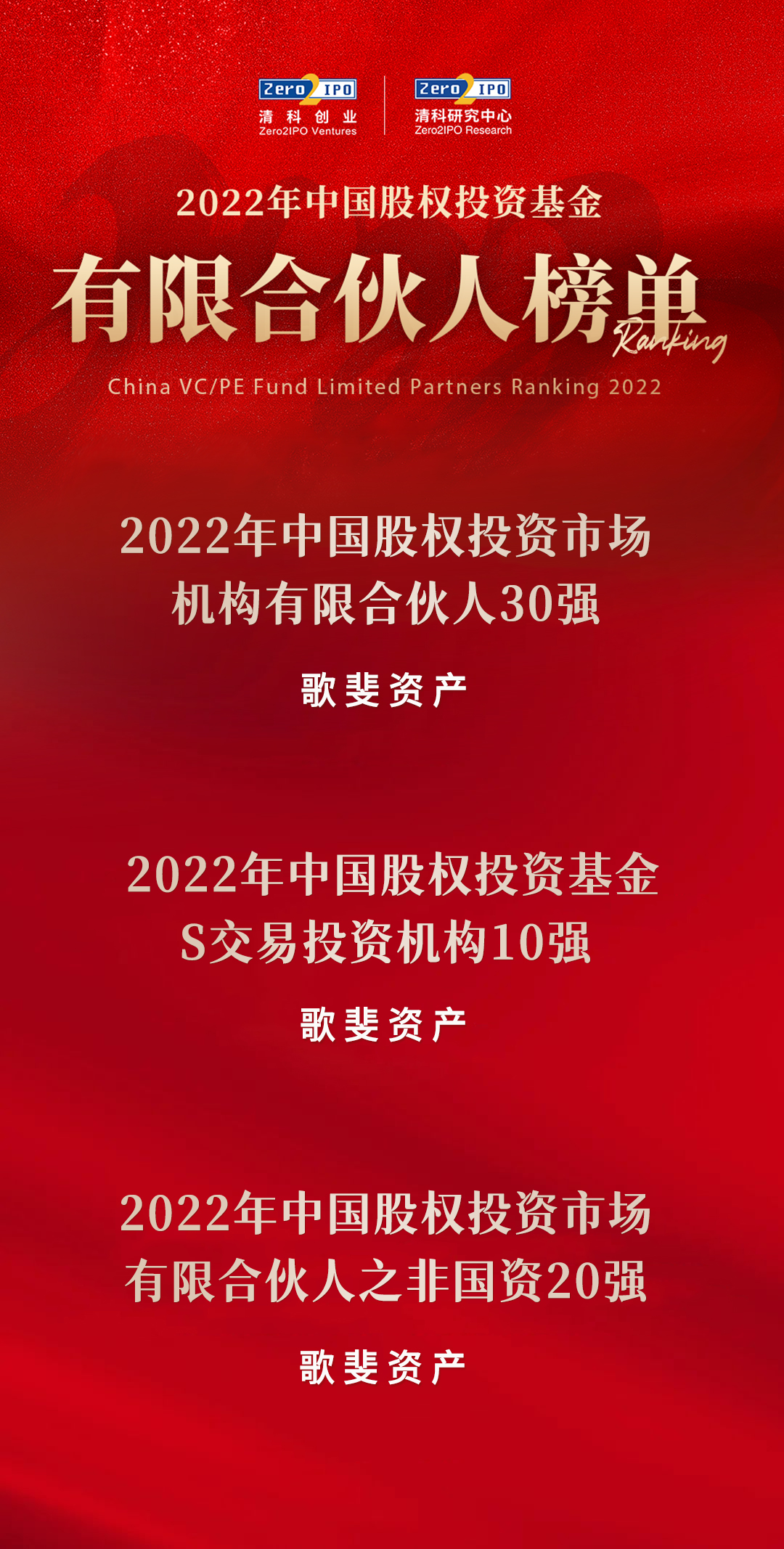 同時,歌斐資產(chǎn)榮獲「2022年中國股權(quán)投資基金S交易投資機構(gòu)10強」、「2022年中國股權(quán)投資市場有限合伙人之非國資20強」。